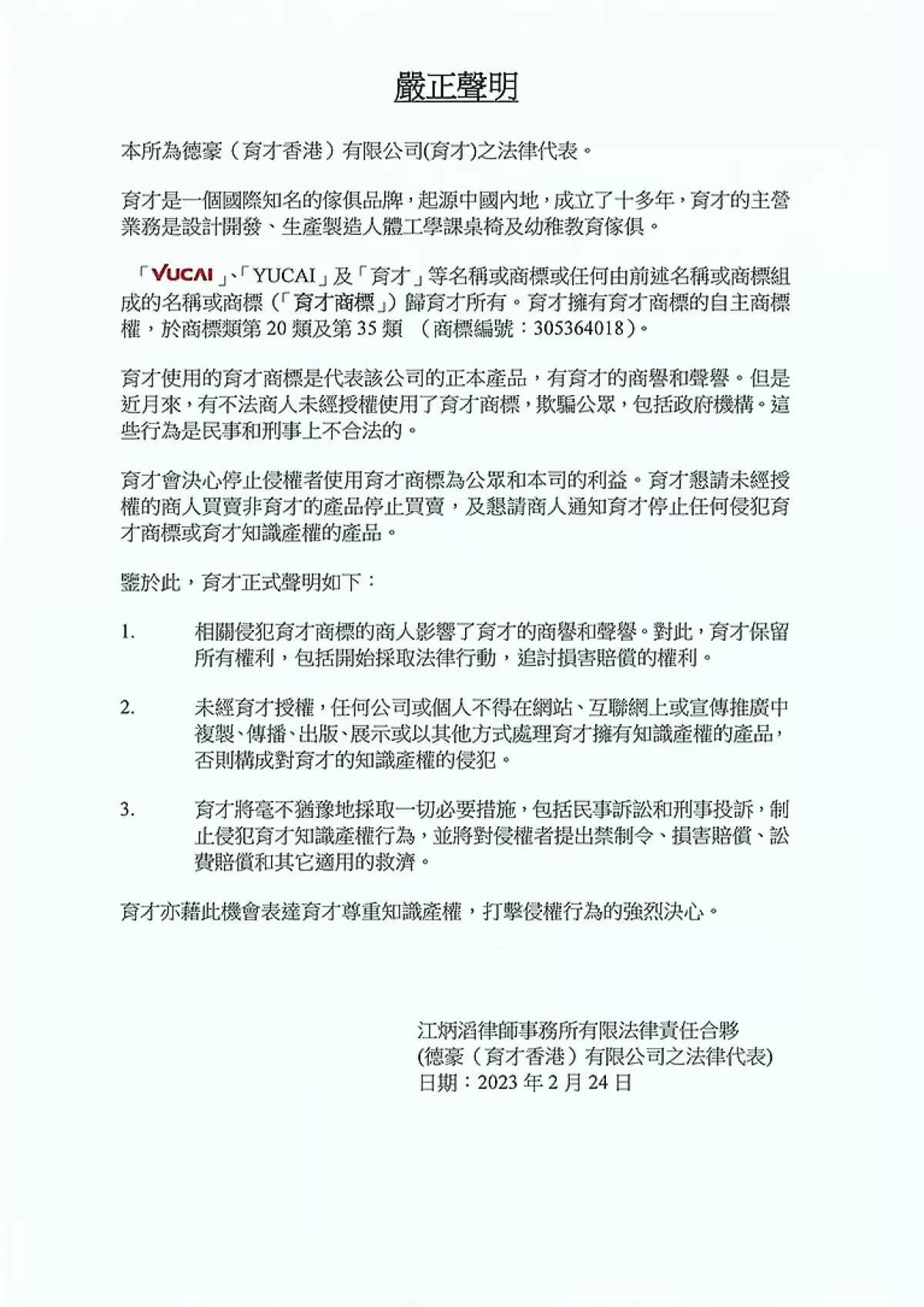 德豪(育才香港)有限公司 嚴正聲明